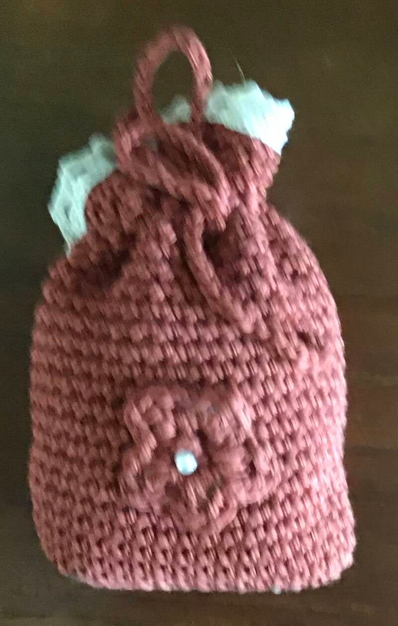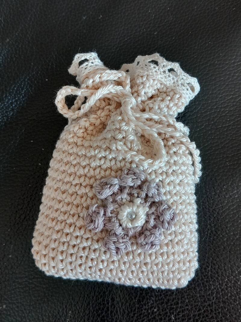 8. Paars geurzakje met een lila bloemetje en een gehaakt randje.
