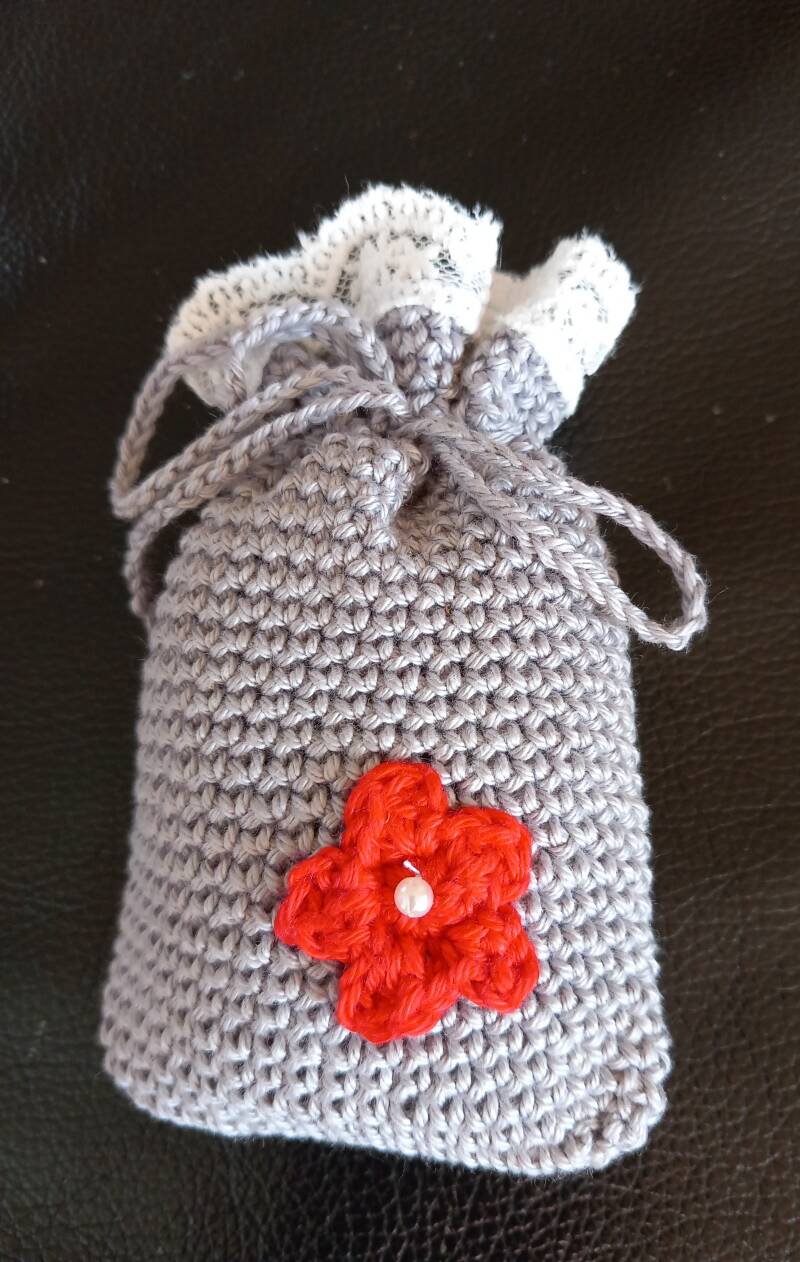 11. Geurzakje in kleur licht grijs, met een rode bloemetje en een wit kantje.