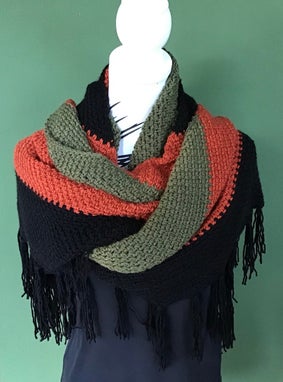 Gehaakte omslagdoek in mooie herfst kleuren. Materiaal is 100% acryl.