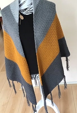 Heerlijke, zachte, ruime omslagdoek. Gehaakt met Stylecraft Special DK. Op diverse manieren te dragen en voor alle jaargetijden. Afmeting: 95 x 200 cm. Gehaakt in 3 kleuren grijs en okergeel.