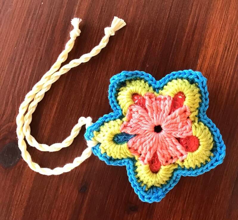 Gehaakte paaseierenhouders in bloemvorm. Ze zijn gehaakt met restanten katoen. Er zit een koordje aan, zodat ze kunnen worden opgehangen.