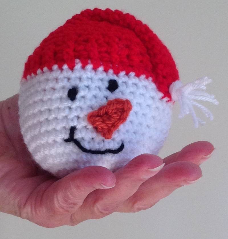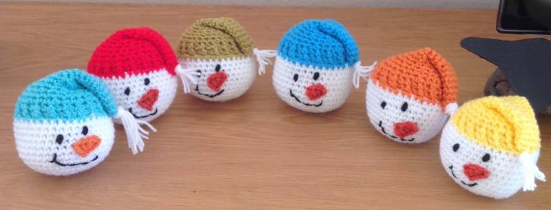 Om een indruk te geven hoe groot ze ongeveer zijn, heb ik er eentje in mijn hand. De popjes hebben verschillende kleuren mutsjes. Wil je graag een ander kleur mutsje? Dit is mogelijk. Of wil je zelf een sneeuwpopje haken? De link naar het patroon staat in het blad "Haakpatronen".
